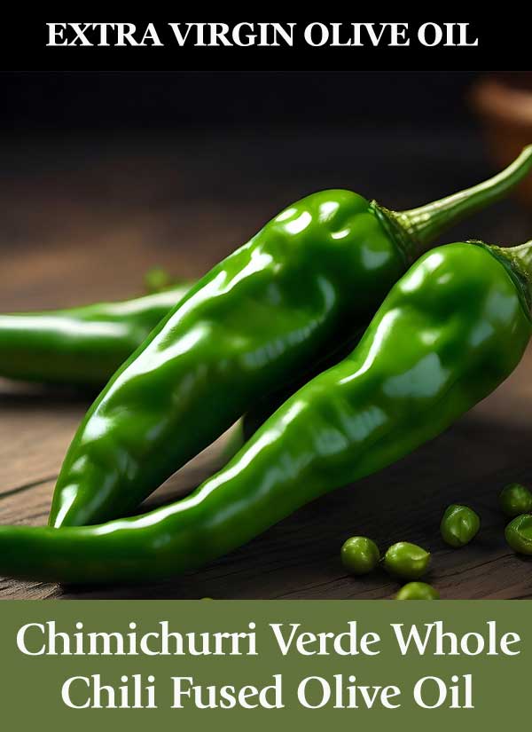 Our delightfully spicy and pungent Chimichurri Verde Olive Oil made witja base of fused green chili olive oil flavored with a medley of spices and herbs including garlic, cilantro, parsley, oregano, black pepper, and red chili.