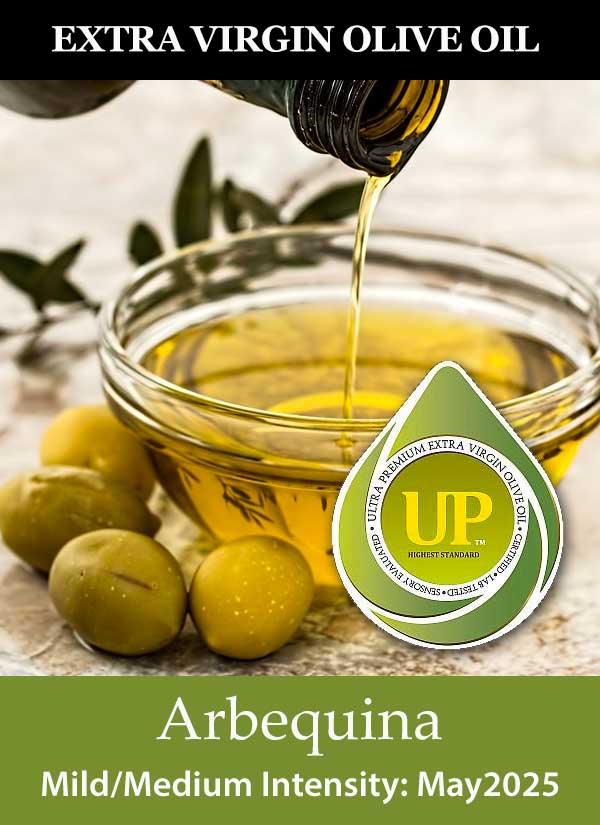 Our Chilean Arbequina has a creamy mouth feel and displays sweet almond in the center with a pleasing savory finish, reminiscent of green tera and spicy arugula.